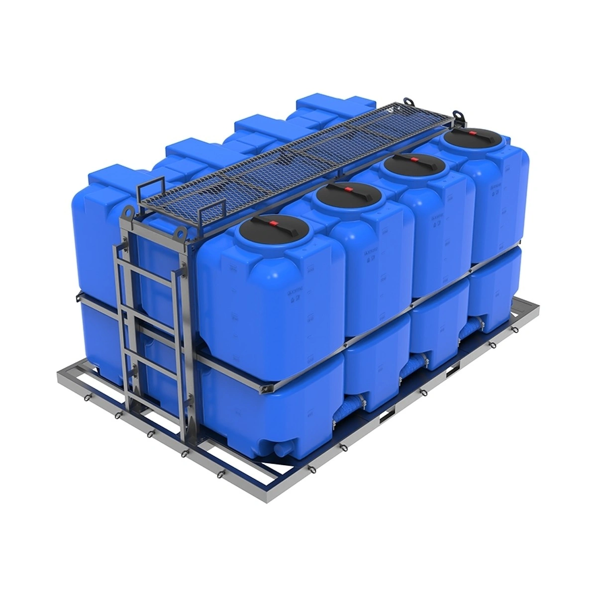 безопасная транспортировка: прочная обрешетка надежно фиксирует емкости, предотвращая их смещение в любом направлении, а низкий центр тяжести всей кассеты обеспечивает повышенную устойчивость транспортного средства в пути;