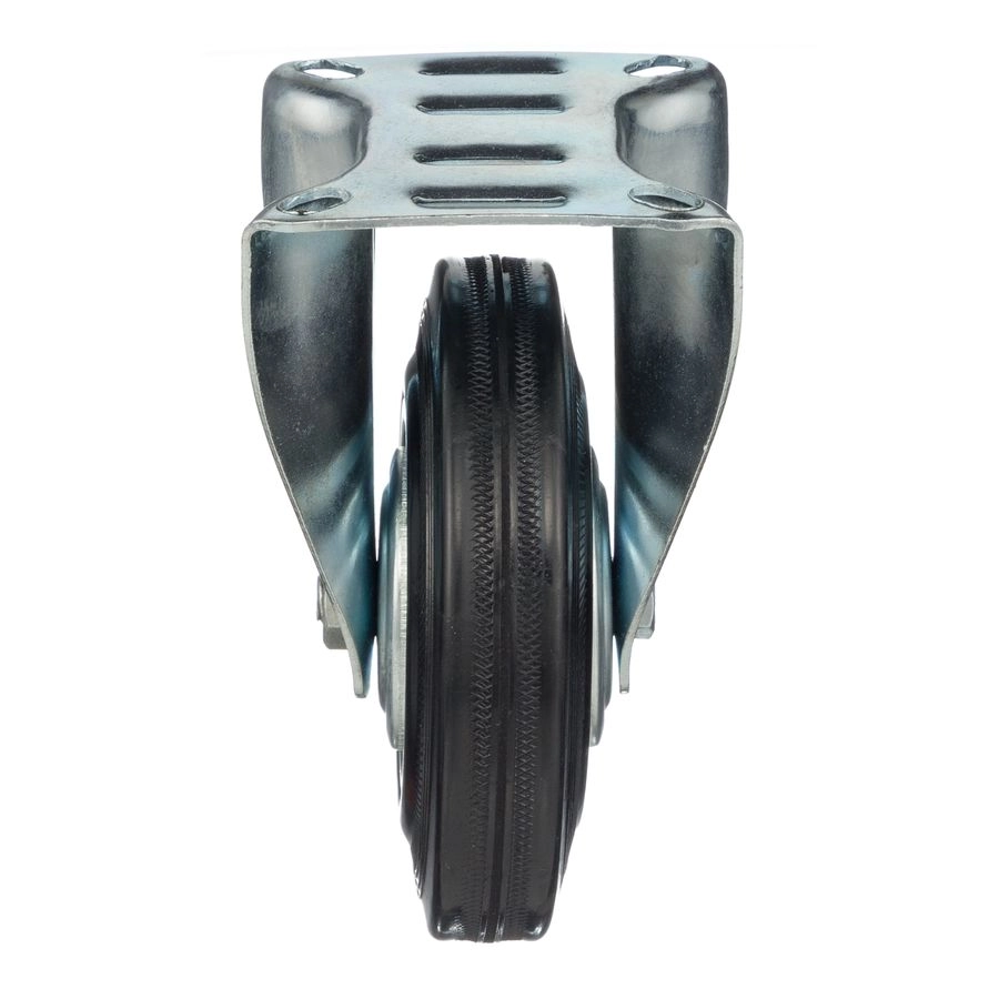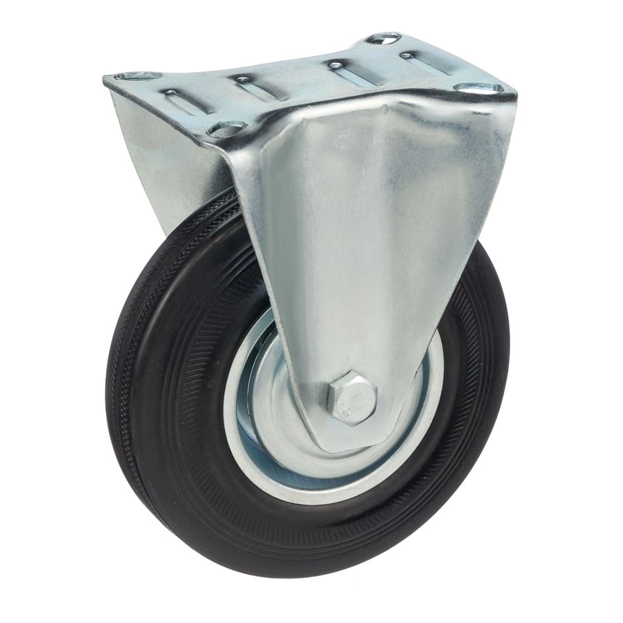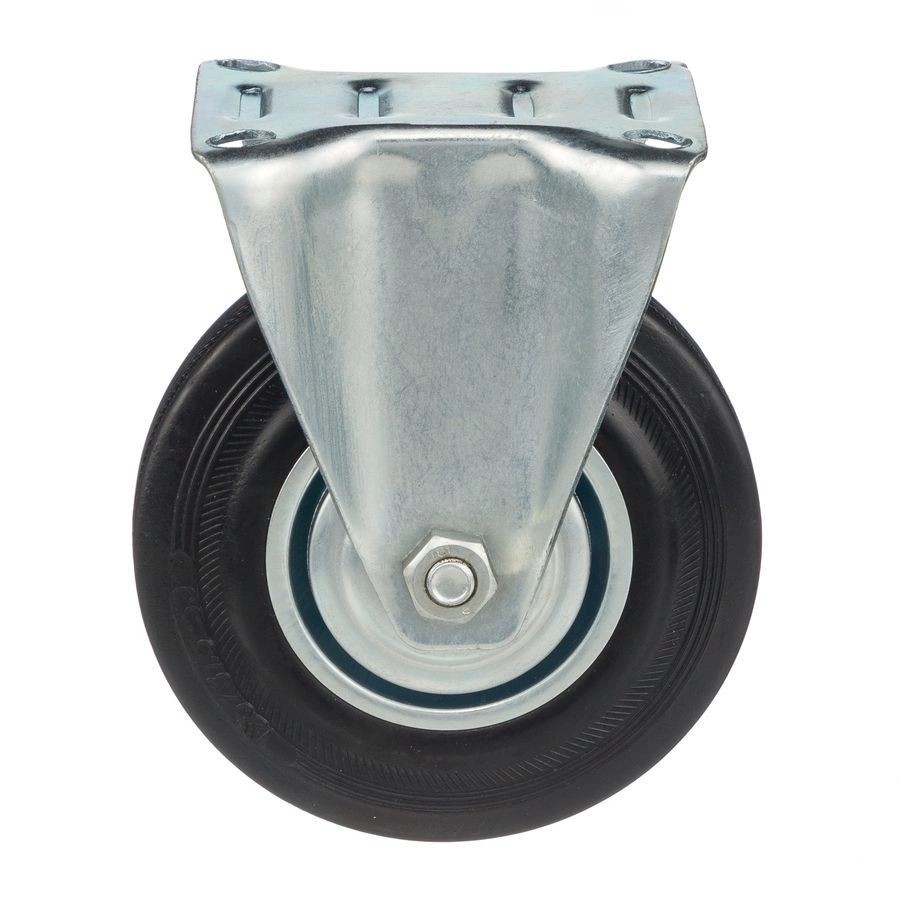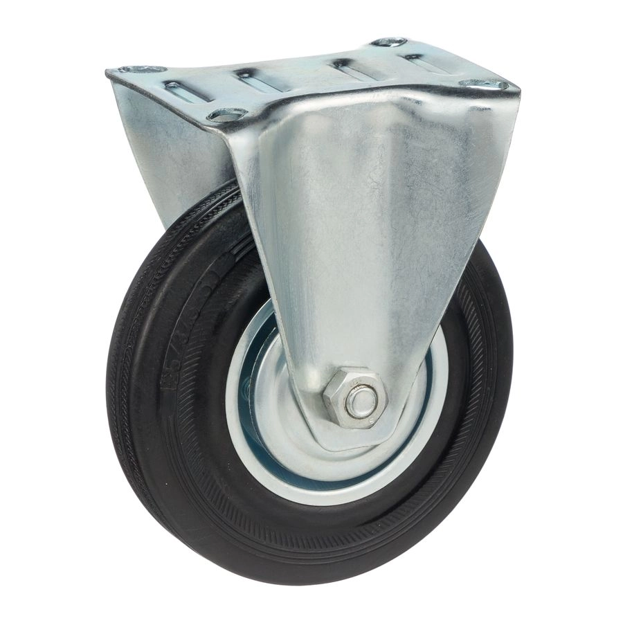 Колесо неповоротное 4002-120, диаметр 120мм., грузоподъемность 100кг. Колеса из черной литой резины, центр из двух гальванизированных дисков из штампованной стали. Роликовый (игольчатый) подшипник расположен в углублении, выдавленном под прессом, и содержит цилиндрические ролики подшипника. Неповоротный кронштейн изготовлен прессованием из листовой стали. Возможно применение на относительно грубых полах складов, заводов, производственных и строительных площадках. Данные колеса можно использовать на неровных поверхностях, во влажной окружающей среде и использовании вне помещения, не рекомендуется применять в среде с органическими растворителями, хлорированными веществами, гидрокарбонатами и минеральными маслами. Температура эксплуатации от -20 до +70С.