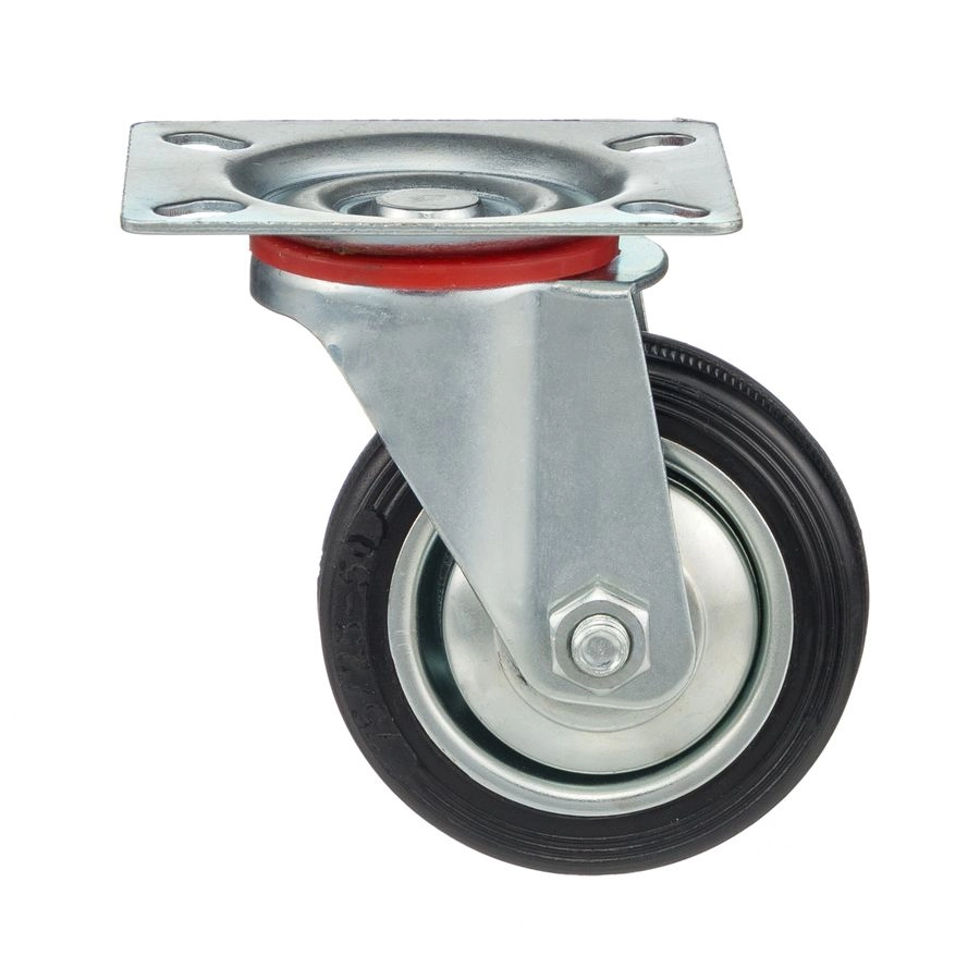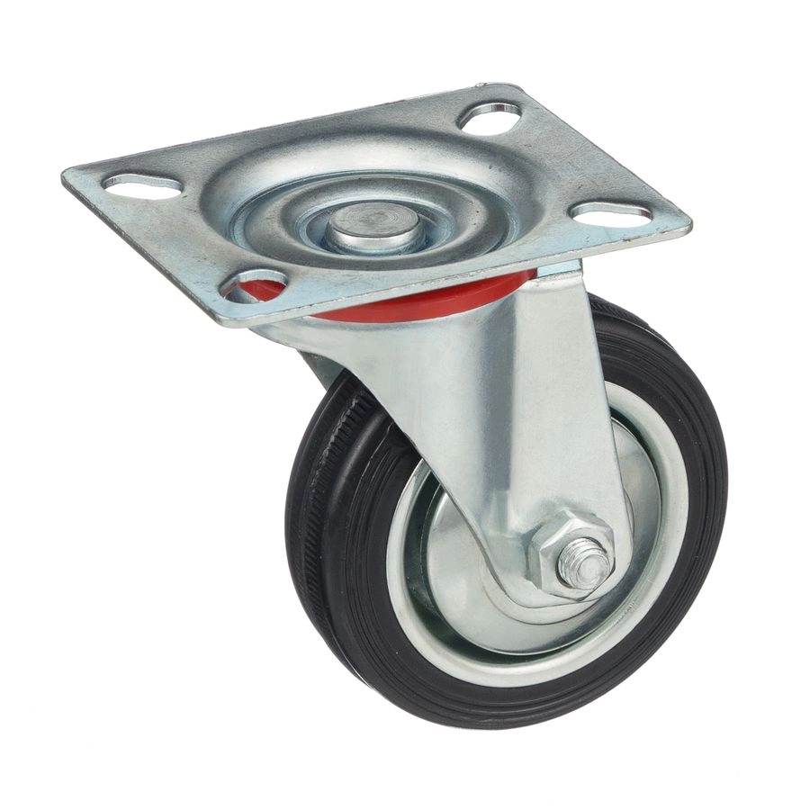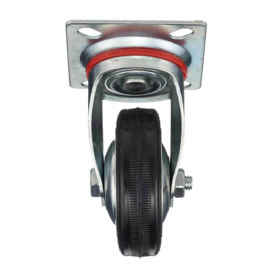 Колесо поворотное 4001-75, диаметр 75мм., грузоподъемность 50кг. Колеса из черной литой резины, центр из двух гальванизированных дисков из штампованной стали. Роликовый (игольчатый) подшипник расположен в углублении, выдавленном под прессом, и содержит цилиндрические ролики подшипника. Кронштейн изготовлен прессованием из листовой стали. В поворотном узле двухрядный шарикоподшипник. Возможно применение на относительно грубых полах складов, заводов, производственных и строительных площадках. Данные колеса можно использовать на неровных поверхностях, во влажной окружающей среде и использовании вне помещения, не рекомендуется применять в среде с органическими растворителями, хлорированными веществами, гидрокарбонатами и минеральными маслами. Температура эксплуатации от -20 до +70С.