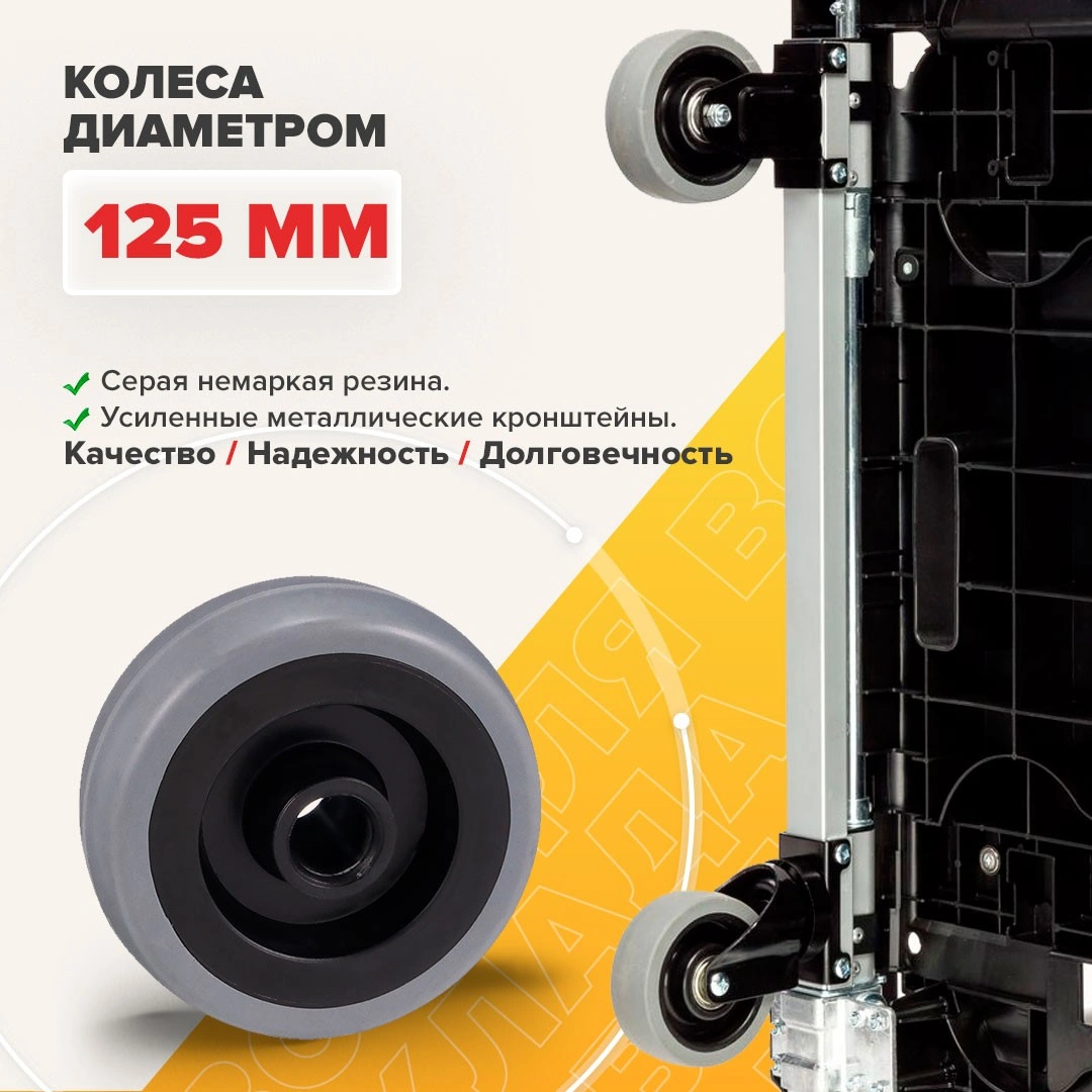 Платформенная складная тележка FF-XL - это удобное приспособление для перевозки упакованных или штучных грузов. Тележка имеет складную конструкцию, поэтому удобна в хранении. Разложить конструкцию можно очень быстро и без лишних усилий. Размер платформы 840х560мм, максимальная высота ручки 980мм., диаметр колес 125мм. При компактных габаритах на тележке можно перевозить грузы весом до 200кг. Складные тележки идеально подходят для транспортировки выставочного оборудования, обслуживания маленьких складов и перевозки грузов в домашних условиях или во время путешествий. За счет узкого профиля и компактных размеров технику легко разместить в багажнике машины.