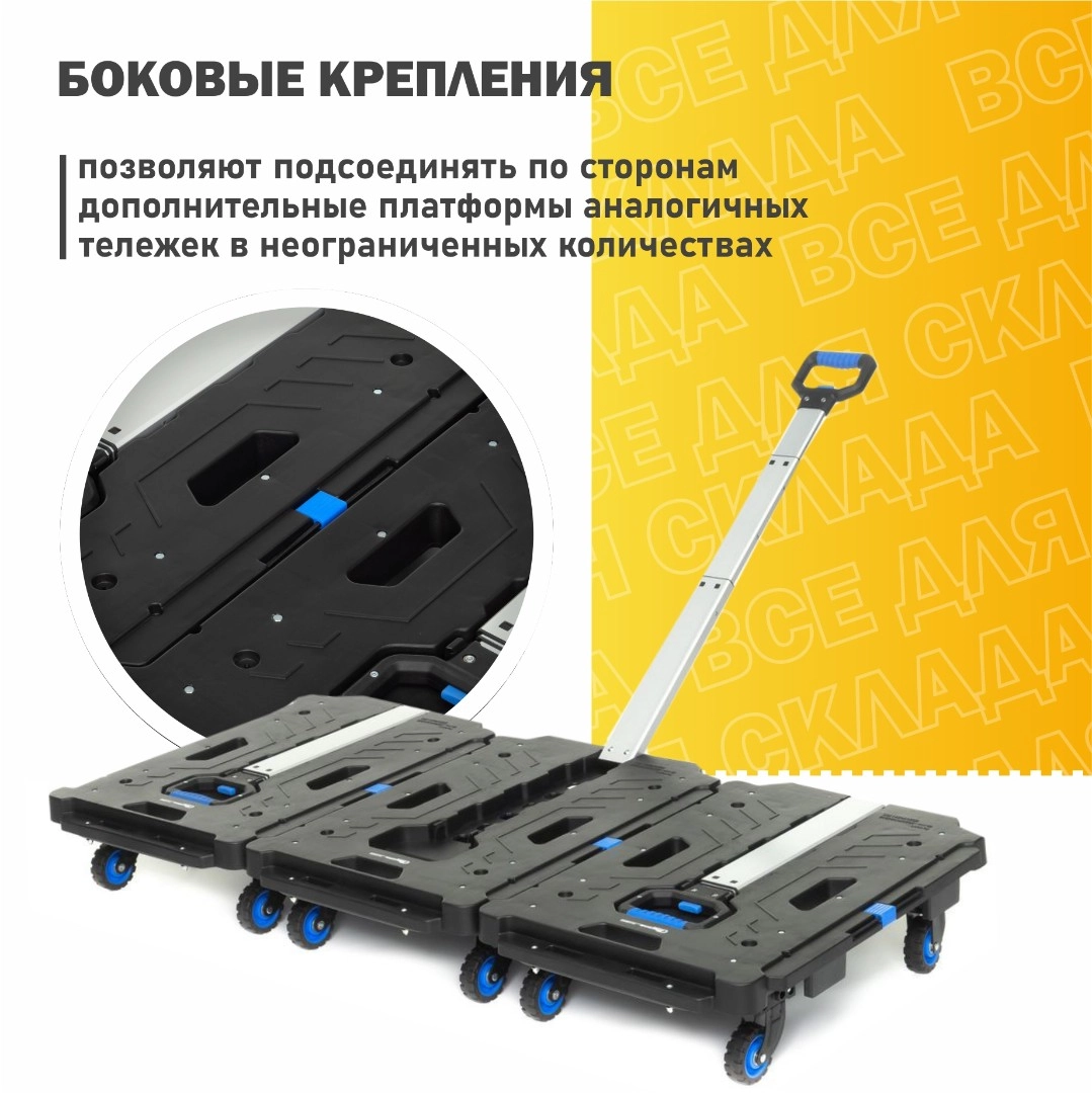 Тележка платформенная FW-99HA складная. Материал: алюминий, сталь, пластик. Грузоподъемность 137 кг. Тележка имеет четыре колеса из термопластичной резины диаметром 76 мм, шириной 25 мм. Расстояние между колесами (колея) 420 мм. Уникальность тележки в боковых креплениях, позволяющих подсоединять по сторонам дополнительные платформы аналогичных тележек в неограниченных количествах, для перемещения негабаритных, длинных / широких грузов (рулонов, труб), а удобная ручка, позволяет перемещать / тянуть груз за собой.
