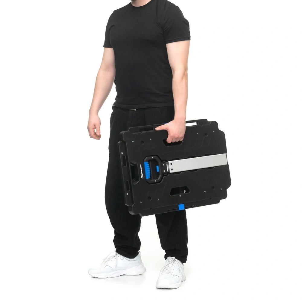 Размер платформы 450х620 мм. Высота платформы от поверхности перемещения (клиренс) 16 см. Регулировка ручки по высоте возможна в трех положениях и составляет от платформы: 46,5; 72 и 91 см. Общая высота тележки с ручкой в положениях: 1. - 62,5 см; 2. - 88 см.; 3.- 107 см. Габариты тележки в сложенном, транспортировочном состоянии: 450х620х107 мм. Вес 5,4 кг.