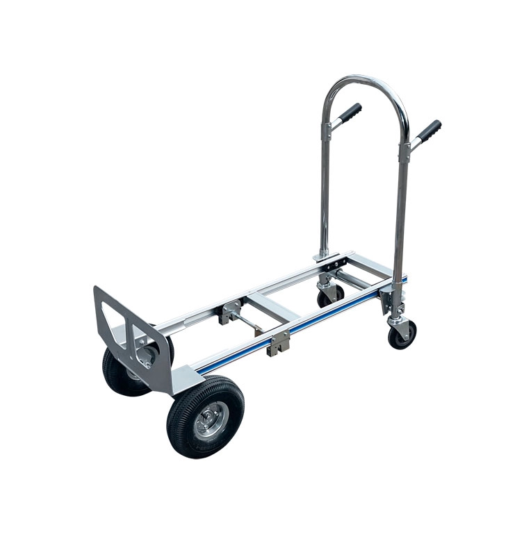 Тележка-трансформер КТ-2143 универсальна и предназначена для работы с разного рода грузами, не превышающими 200кг. (баллоны, бутыли, бочки и т. д.). Тележка КТ-2143 может использоваться как двухколесная тележка и при необходимости трансформируется в четырехколесную тележку. КТ-2143 имеет два пневматических колеса с металлическими дисками и два поворотных пластиковых. Благодаря двум пневматическим колесам и удобным ручкам, осуществляющим хороший захват, тележка может двигаться с минимальным сотрясением груза. Диаметр колес 2х260мм. (пневматические) и 2х125мм. Размер площадки в разобранном виде 950х305мм., в собранном виде 450х180мм.