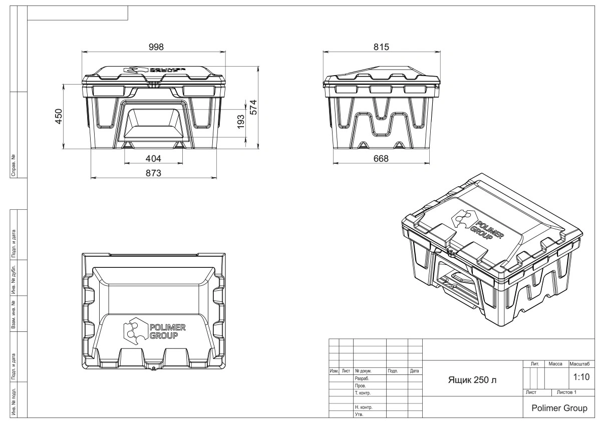 Объем контейнера для песка 250 л. Предназначен для хранения песка, применяемого для тушения пожаров на заправочных станциях. Изготовлен из полиэтилена методом ротоформования, что придает особую прочность.